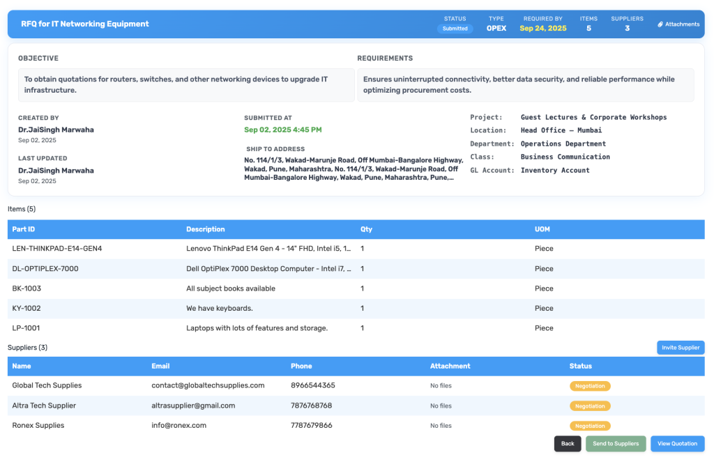 Streamline your Request for Quotation (RFQ) process from start to finish. Add items, select suppliers, approve and submit - our RFQ module makes procurement seamless and transparent.