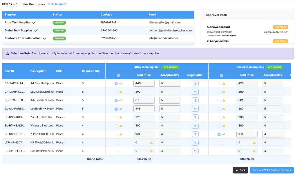 Streamline your Request for Quotation (RFQ) process from start to finish. Add items, select suppliers, approve and submit our RFQ module makes procurement seamless and transparent.