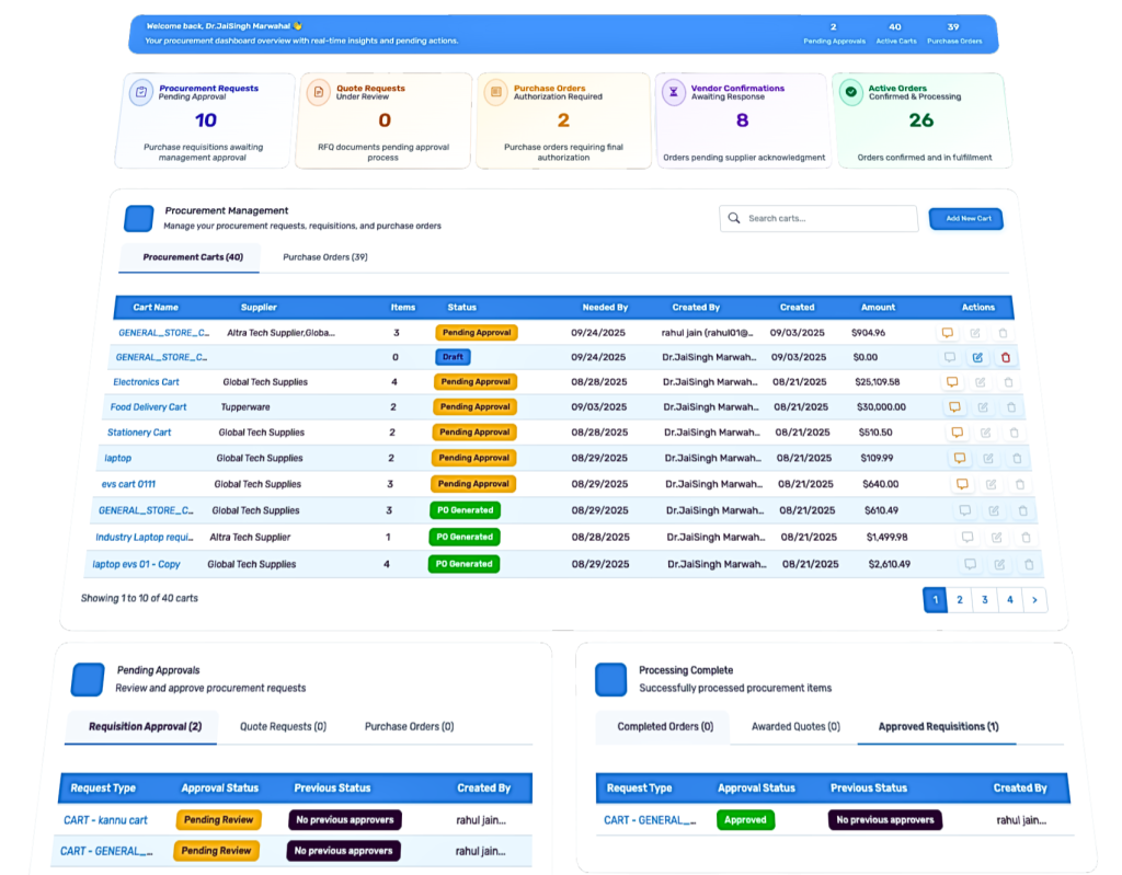 From planning to purchasing, track expenses, monitor thresholds, and check available funds instantlyeven while creating a Cart or RFQ.